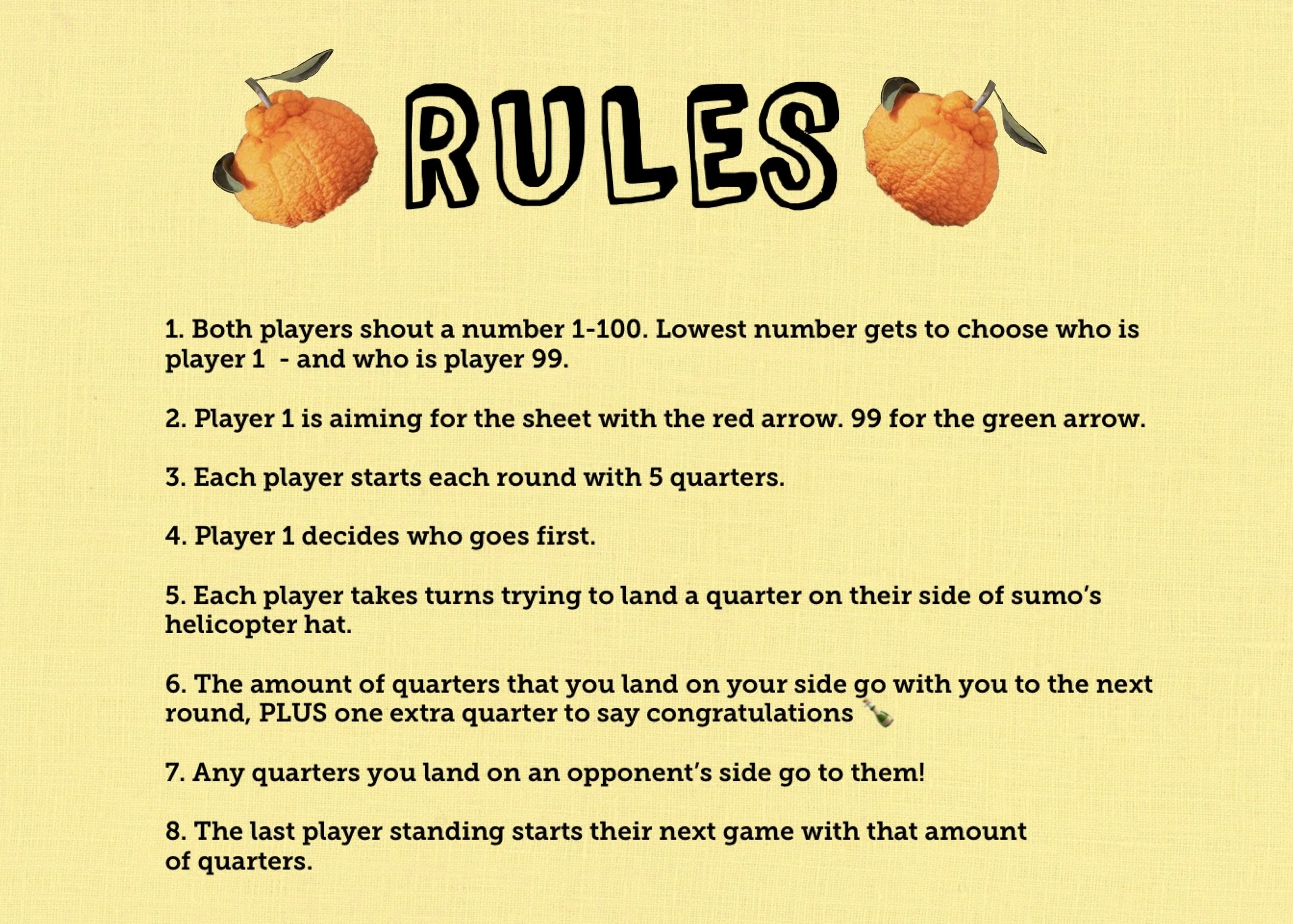 You place the coins through the slider and aim for your side of Sumo's helicopter hat. Depending on how many of yours stick, you might get a bonus quarter to play with during the next round.